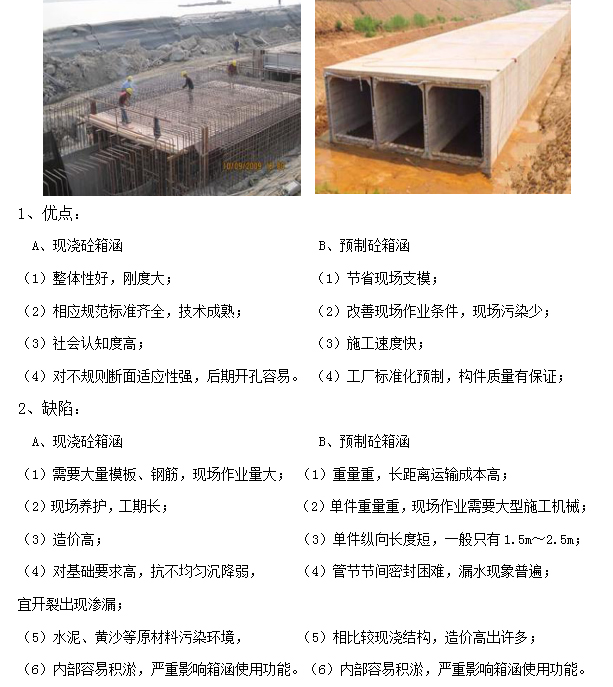 由鋼筋混凝土或圬工材料制成箱形管節(jié)的涵洞,可用來輸水、排水、蓄水、行洪,過人及車輛通過。箱涵施工一般采用現(xiàn)澆,也有部分采用預(yù)制砼。其優(yōu)缺點如下: