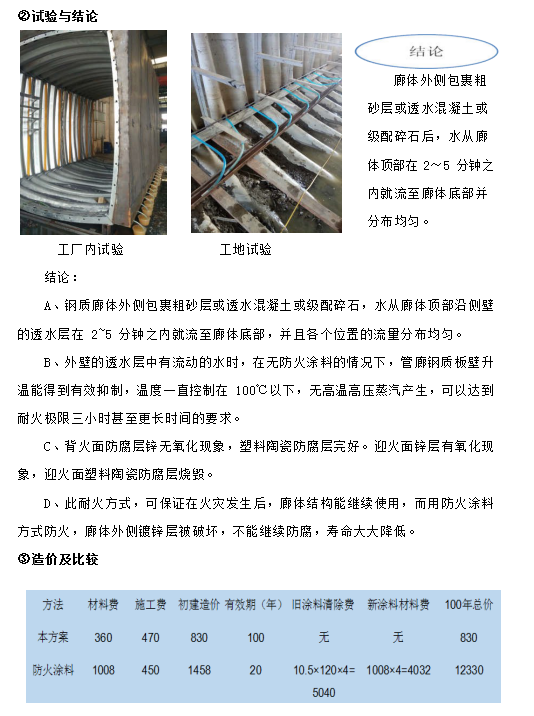 ⑨ 應對耐火極限三小時的方式是涂耐火涂料,但耐火涂料壽命只有 10~20 年, 并且不能長期耐潮,在壽命到期失效后重新涂刷時,由于內(nèi)部管線及設施的存在, 清除殘余失效涂層的工作量大,涂刷新涂層更繁雜,費用較初次施工時大大增加, 并且在管廊整個壽命周期內(nèi)要多次更換防火涂層;更為重要的是,耐火涂料只能阻止火災時鋼結(jié)構(gòu)的溫度不高于 550℃,但對于鋼結(jié)構(gòu)地下管廊來說情況特殊,在火災發(fā)生半小時左右,耐火涂料覆蓋的鋼結(jié)構(gòu)體溫度就超過 150℃,廊體外部土壤中的水份形成高溫高壓蒸汽,其產(chǎn)生的次生災害有可能嚴重于火災本身。