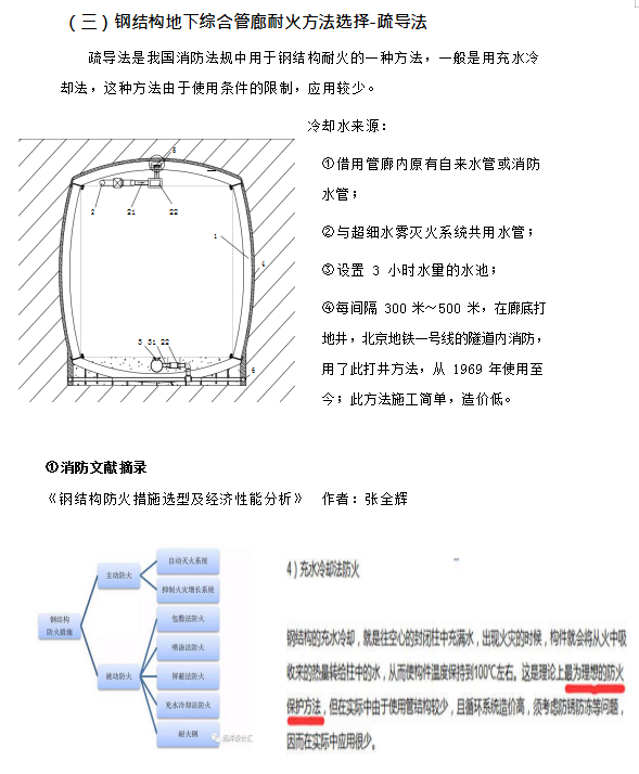 ⑨ 應對耐火極限三小時的方式是涂耐火涂料,但耐火涂料壽命只有 10~20 年, 并且不能長期耐潮,在壽命到期失效后重新涂刷時,由于內(nèi)部管線及設施的存在, 清除殘余失效涂層的工作量大,涂刷新涂層更繁雜,費用較初次施工時大大增加, 并且在管廊整個壽命周期內(nèi)要多次更換防火涂層;更為重要的是,耐火涂料只能阻止火災時鋼結(jié)構(gòu)的溫度不高于 550℃,但對于鋼結(jié)構(gòu)地下管廊來說情況特殊,在火災發(fā)生半小時左右,耐火涂料覆蓋的鋼結(jié)構(gòu)體溫度就超過 150℃,廊體外部土壤中的水份形成高溫高壓蒸汽,其產(chǎn)生的次生災害有可能嚴重于火災本身。